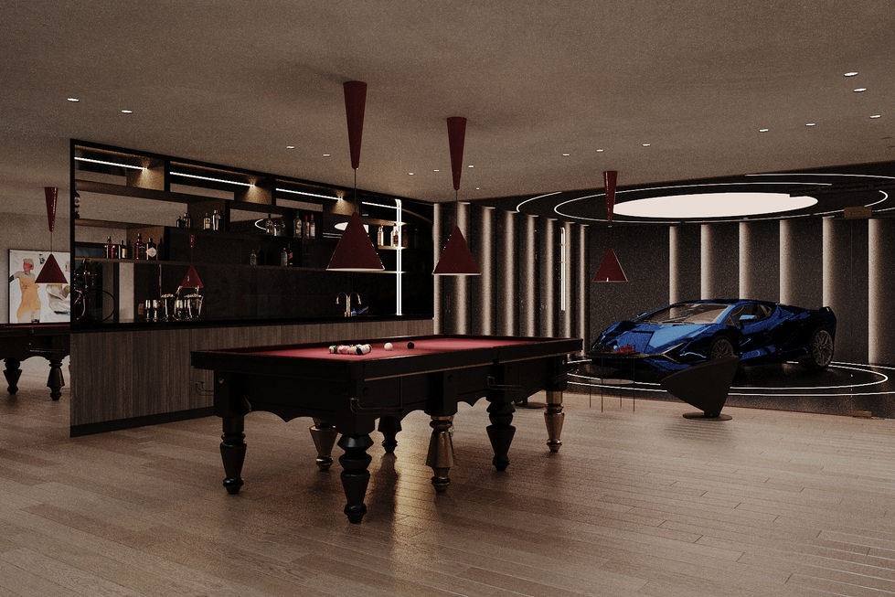 The true gem of this home is the billiard room, where an exclusive billiard table is surrounded by a glass wall, through which you can see a Lamborghini rotating on a pedestal — a striking element of the interior, as vibrant and impressive as the house itself.
